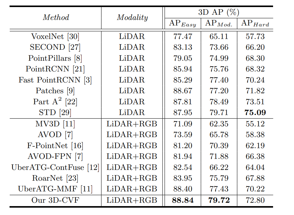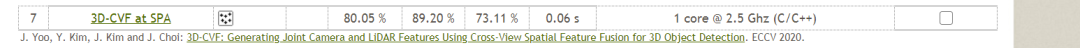 在KITTI上的3D目标检测,目前排名是第七名(但是就发表的文章上看,SVGA这篇文章目前是效果最好的,但是在KITTI-benchmark上并没有公布)一些参数设置都是和之前的网络一致,就不细说。