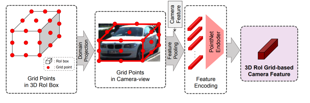 这里作者的采用和MVF中一样的方法,如下图所示,对proposals的边界上采取一定的grid点,然后投影到camera-view上,然后采用pointnet将特征转化到grid上,最后做进一步的优化。