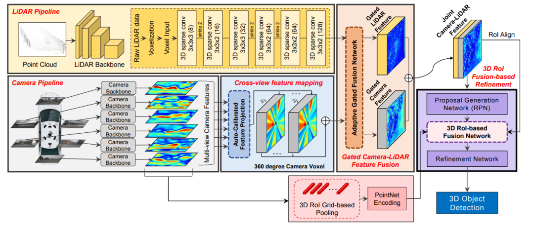 proposals产生于上述融合得到的camera-LiDAR feature map,接下来就是做来两阶段的refine工作。尽管camera-LiDAR feature map中已经存在一定的camera信息,但是作者又进一步将camera特征做了进一步的特取和融合:采用pointnet提取camra信息和采用3D-RoI-based fusion网络和camera-LiDAR feature map做特征融合。