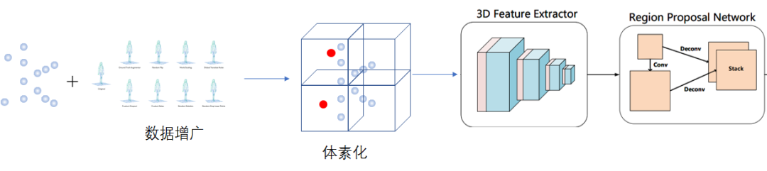 这里利用的点云特征提取网络是笔者在3D目标检测深度学习方法中voxel-represetnation内容综述(一)中提到过个voxel-backbone。笔者这里做了一个简洁的示意如下:点云首先做一些数据增广,然后体素化分到voxel中,再经过稀疏卷积和子流型卷积搭建的稀疏backbone转化为二维feature-map,最后采用一个简单的“下采样-上采样”结构得到最后的feature-map。但是在本文中再提proposals之前仅仅使用了RPN网络之前的voxel点云特征信息提取。