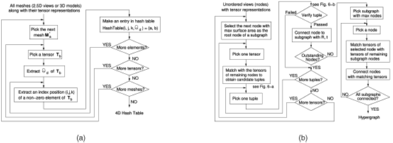 图1如上图a显示了hasi的33个视图的连通图算法的跟踪,该算法选择具有最大表面积的网格MR作为根节点来初始化生成树图, 然后,MR的张量与搜索空间中剩余网格的张量匹配,具有匹配张量的节点从搜索空间中移除,并以表示两个节点之间刚性变换的圆弧连接到MR,当MR的所有张量都匹配,从生成树中选择另一个节点,其张量与搜索空间中剩余节点的张量匹配,此过程继续进行,直到所有节点都添加到生成树, 每次将新节点添加到生成树时,搜索空间都会减少,这为算法提供了进一步的效率。(2)超图算法