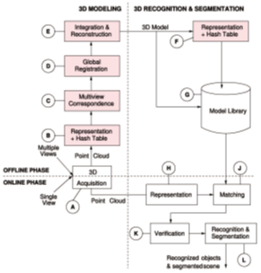 在杂波和遮挡情况下,对自由形式物体的识别及分割是一项具有挑战性的任务。本文提出了一种新的基于三维模型的算法,该算法可以有效地执行该任务,对象的三维模型是从其多个无序范围图像离线自动构建的,这些视图被转换为多维,用张量表示,通过使用基于哈希表的投票方案将视图的张量与其余视图的张量匹配,这些视图之间自动建立对应关系,形成一个相对转换图,用于将视图集成到无缝3D模型之前注册视图,该模型及其张量表示构成了模型库。在在线识别过程中,通过投票场景中的张量与库中的张量同时匹配,对于得票最多的模型张量并计算相似性度量,进而被转换为场景,如果它与场景中的对象精确对齐,则该对象被声明为识别和分割。这个过程被重复,直到场景完全分割。与自旋图像的比较表明,本文算法在识别率和效率方面都是优越的。