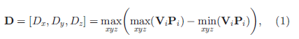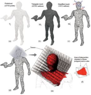 如上图所示,将点云图 (其中是三维坐标的矩阵)转换为三角形网格,由于性能原因,每个被抽取,以获取,然后对的每个顶点和三角面计算法线,如果包含整个物体并完全覆盖其表面,则可以使用(1)计算其近似维数D。