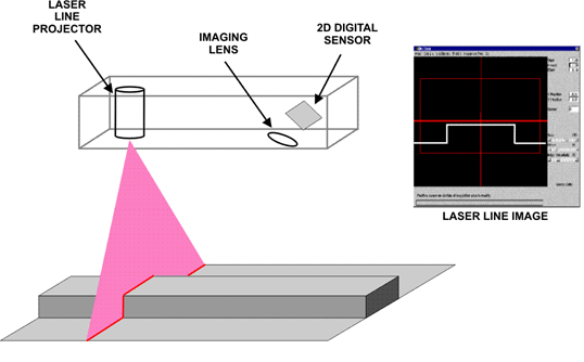 将一条单线细激光光线投射到物体表面,由于物体表面高度发生变化,使得激光线发生了弯曲,根据这个线的变形,可以计算出精确的物体表面三维轮廓。如下图所示,基本组成结构有:1) 2D/3D相机 2)线激光 3)镜头 4)固定架和安装方法