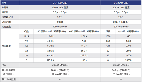 我近期所做项目,对行频和精度要求偏高,所以还是选取的3D相机的方案。德国的SICK、AT相机是工业检测应用中用的比较多的两款3D相机了,最高行频都可以做到几十KHZ,以AT相机为例,具体参数如下: