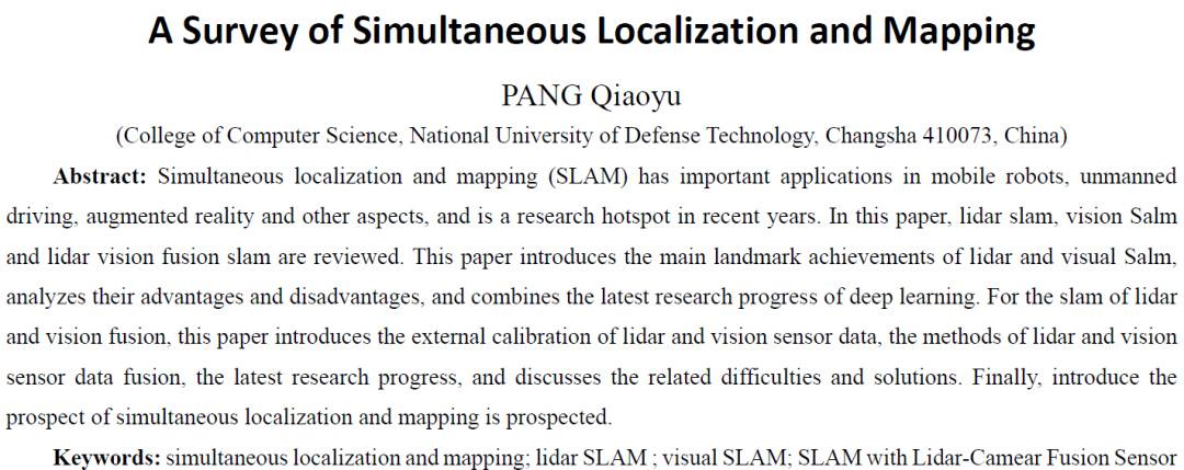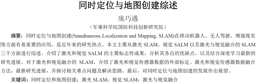 [2] Durrant H, Bailey T. Simultaneous localization and mapping(slam):Part i[J]. IEEE Robotics & Automation Magazine, 2006, 13(2): 99-110.