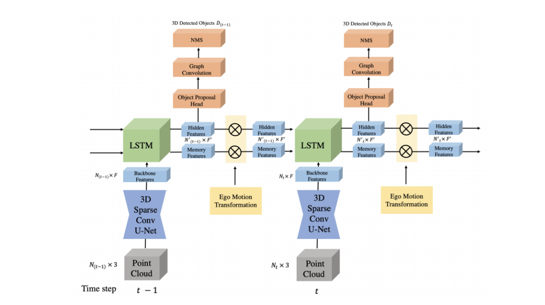 overall的网络结构如上图所示,每一帧的点云信息都是首先通过一个稀疏卷积搭建的U-Net做处理,然后3D稀疏LSTM将backbone特征和memory中的上一帧的特征做融合,然后再通过FPS和NMS对最后的结果做后处理。