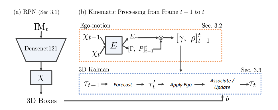 网络主要的结构如上图所示,首先易容RPN网络预测最先的3D BBOX,然后进一步使用卡尔曼预测速度更新上一次的tracking为这一次的tracking。最后将这一次的跟踪内容和检测做进一步的融合。