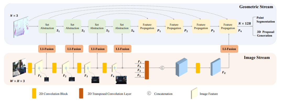 如下图所示的网络结构图,首先可以看出这也是一篇Image信息和点云信息融合的研究,其次可以简单看出融合的方法是采用multi-scale的feature-fusion融合,主体backbone是pointnet++网络结构;图像stream的结构主要是一个FPN层的语义分割特征,通过作者设计的多个L1-Fusion模块,作者采用对应scale的融合特征来解决图像信息和点云信息的互补补全。第二个创新点在于作者提出的CE-loss,该损失函数联合了置信度分数和与gt的IOU大小,认为置信度大的proposals对应的IOU重合度也应该相应比较大。就作者文中的实验来看,在添加了CE-loss后,其在val上的精度可以提升3%。