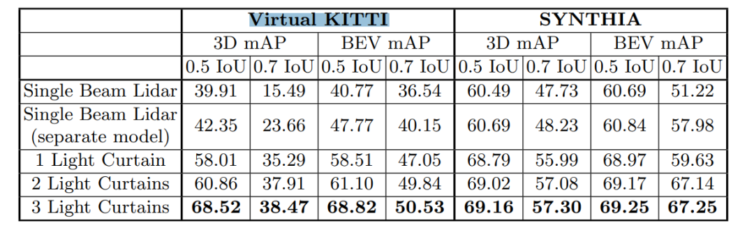 主体网络结构如上图所示,上面的分支表示作者采用一个单线雷达做目标检测任务,detector的不确定度被用来最优化的放置一个包含了最大不确定区域的light curtain。然后那些通过light curtain检测出来的点(表示为绿色)返回到detection最初始的划分voxel阶段,然后进一步更新目标检测结果。作者在Virtual KITTI上做的实验,式样效果如下,可以看出多条light-curtains是能带来更好的精度提升。
