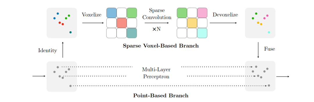 上图表示结合voxel和point特征提取的卷积结构,该图即是(NIPS19)的文章PVCNN的结构,一方面是高效的采用voxel做了特征提取,另一方面是通过point分支而不采用FPS的耗时结构,可以得到MLP提取的特征,最后采用插值的方式得到融合后的特征。