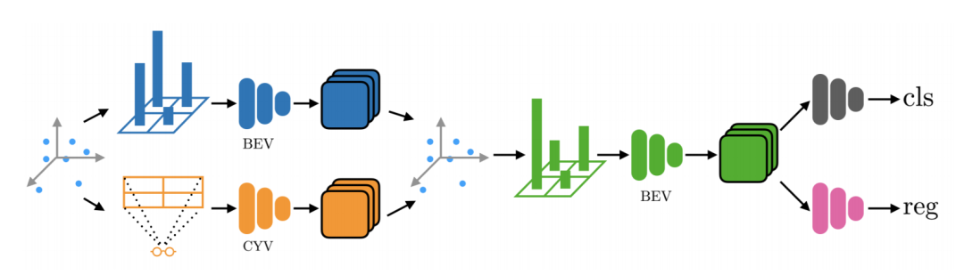 上图表示本文的主体网络结构,点云首先会分别在BEV和CYV视角上进行各自的特征提取,然后将这两个视角的特征进行融合,然后将fusion后的点域特征投影到BEV视角上,再接目前常用的二维RPN做回归和分类。