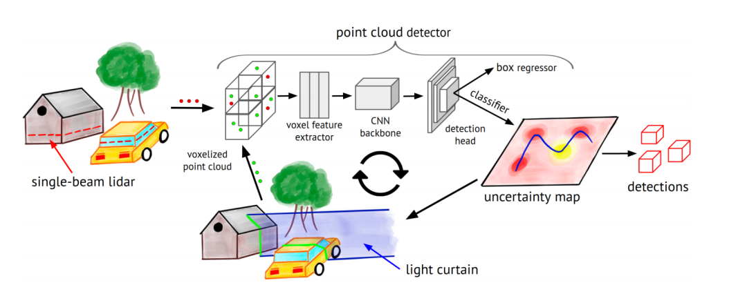 作者单位是CMU,该文提出使用light-curtains(一种传感器)来提高自动驾驶中3D目标检测的识别性能,而且本文的另外一个创新点在于利用3D目标检测预测不确定性来知道运动感知。主要创新点包括有: