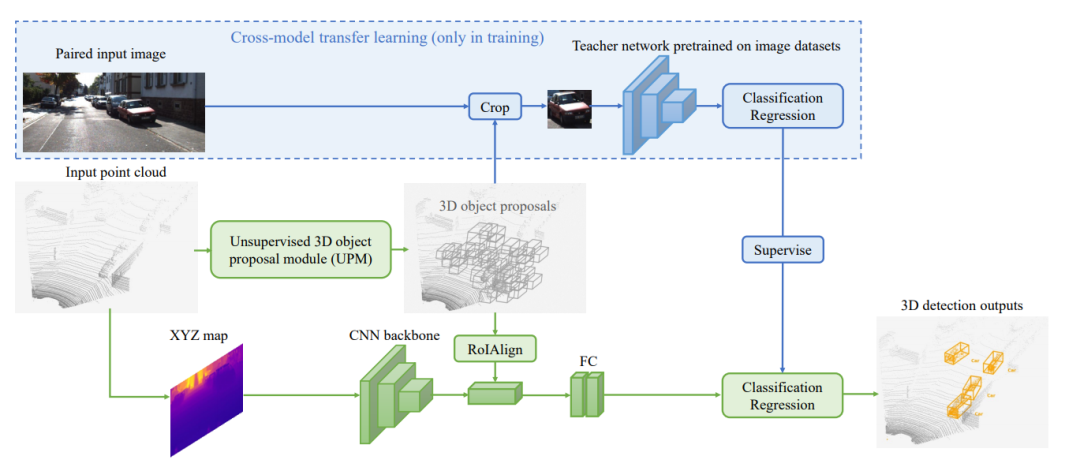 网络结构图如上图所示,网络中第一个重要的部分是无监督proposals提出网络,通过归一化点云密度信息提出proposals。第二个重要的部分是cross-modal transfer模块,该模块的作用是从图像数据集到点云数据集的信息融合。