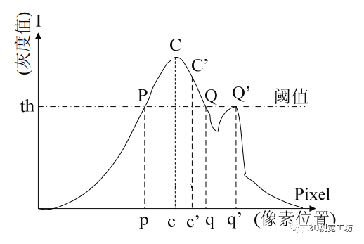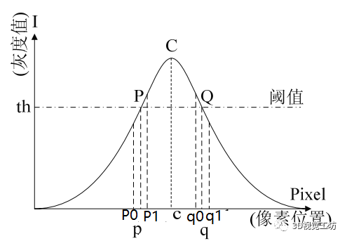 设定阈值T,在光条纹截面上找到最接近阈值的四个点,用这四个点在光条纹截面上的坐标以及灰度值做线性插值,得到光条纹截面上的两个点p,q的坐标,取p,q的中点即为光条纹中心点如图4所示。阈值法可以做到实时提取中心点,但易受到噪声干扰导致线性插值结果出现偏差如图5所示为噪声对阈值法的干扰。