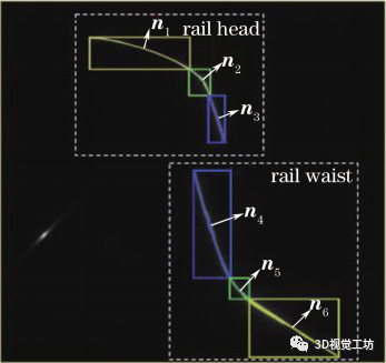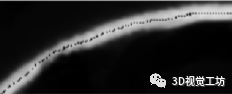 不同于直线光条纹中心线提取,针对大曲率的线结构光条纹中心提取问题,辛军强[34]等利用自适应阈值法分割光条纹与图像背景,对分割出的光条纹采用并行细化算法提取单像素骨架,通过方向模板法获取骨架像素点的法线方向,在法线方向上使用灰度重心法获取光条纹中心点如图7所示。算法准确度较高,可以做到实时检测。