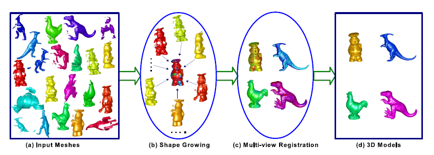 摘要:距离图像配准是三维物体建模和识别的基础研究课题。在本文中,提出了一种精确、鲁棒的多视点距离图像配准算法。首先从一组距离图像中提取一组旋转投影统计(RoPS)特征进行特征匹配。然后使用一种变换估计方法和一种变体对两幅距离图像进行配准迭代最近点(ICP)算法的研究。基于成对配准算法,提出了一种基于形状增长的多视图配准算法。种子形状与选定的范围图像进行初始化,然后通过在自身和输入范围图像之间进行成对的配准顺序更新。所有的输入范围图像在形状增长过程中迭代登记录,并进行广泛的实验来测试算法的性能。本文提出的两两配准算法对小的重叠区域、噪音和变化的网格分辨率具有较高的准确性和鲁棒性,提出的多视图配准算法也非常准确。与现有算法的相比,表明了该算法的优越性。