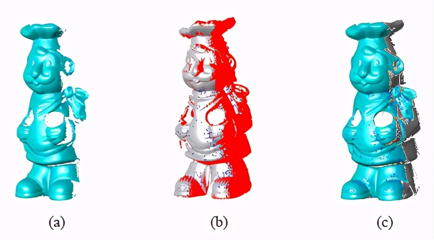 图2 形状成长过程的图解。(a)种子的形状。(b)输入网格,其中红色点表示将要被更新到种子形状的点。(c)更新后的形状。蓝色的点表示输入网格和更新后的形状之间的对应点(最好以颜色显示)。