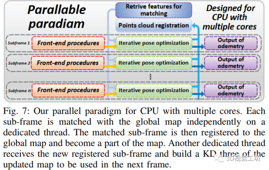 分段线性:把一个新来的帧分成三个连续的子帧,然后把这三个帧独立的和现阶段构建的地图做匹配。在每个子图做scan-match的过程中利用子图中最后一个点的位姿把所有的点投影到全局地图中,这样每帧采样的时间仅为原来的三分之一。尽管这种方法很简单,但是效果很好(LEGO—LOAM中把一帧分为6份应该也是分段线性的思想),分段线性对于多核的CPU并行运算也有好处。