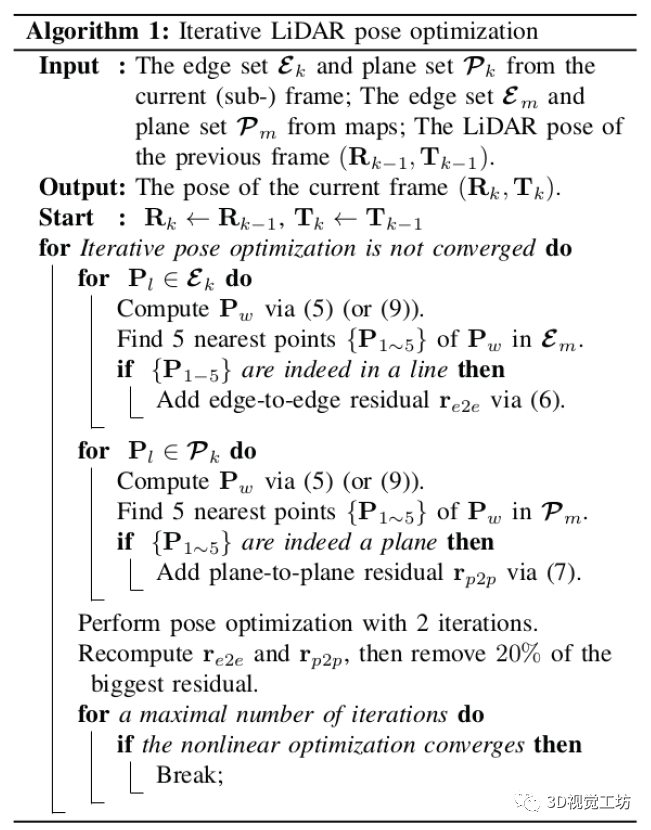 在实际跑的时候避免不了会有动态的车、人及其他物体。本文的动态物体剔除算法是在每一次迭代优化位姿的过程中重新找到每个特征的最近点把边边残差和面面残差加入到目标函数,第一次只优化两次,然后把残差中最大的20%丢弃来达到剔除外点的目的。