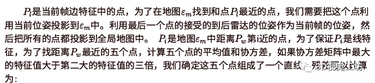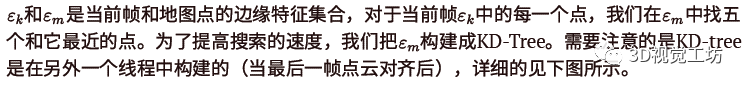 与边缘特征点相似,对于平面中的点当前帧的特征集Pk,我们在地图的平面特征集Pm中找到5个最近的点,同时通过计算它们的协方差矩阵Σ来确保这5的点确实在同一平面内, 如果最小Σ的特征值比第二小的特征值小三倍,我们计算当前帧的地图中平面点到由这5个点组成的平面的距离,然后将此残差添加到姿势优化中。