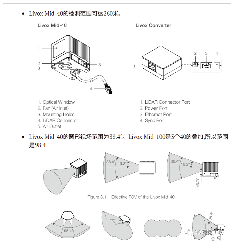 - 固态激光雷达的视角很小,Livox MID40的视角仅有38.4度。但是想要获得大的视角可以使用多个固态的激光雷达(比如MID-100其实就是3个MID-40)。