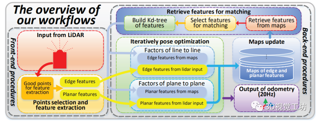 系统概述如下图所示,其前端处理包括点的选取和特征的提取。考虑到激光雷达传感器的low-level物理特性(如激光光斑大小、信噪比)的测量机制,我们进行点级选择来提取“优点”。