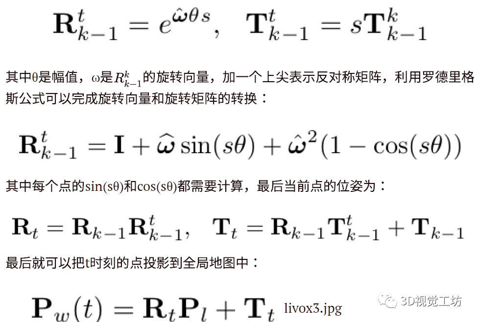 很容易知道每个点采集的时间(自己计算或者激光雷达采集的时候该信息是可保存的),已经知道了上一帧最后一个点的采集时间t_k-1和当前帧最后一个点采集的时间是t_k,在这中间的当前帧的点采集的时间是t,令s=(t-t_k-1)/(t_k-t_k-1),所以t时刻的位姿是: