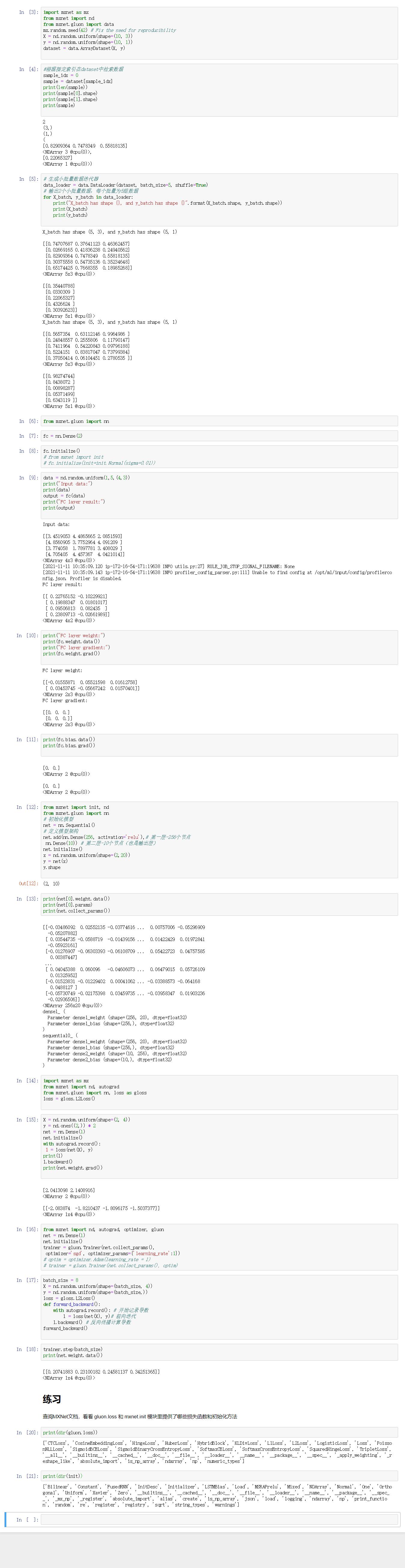 本次实验学习了Gluon基础语法,和线性回归的简洁实现,从而实现基于神经网络实现的手写数字识别,该实验相对复杂。通过本次实验,收获颇多,对神经网络有了进一步的学习与探究。