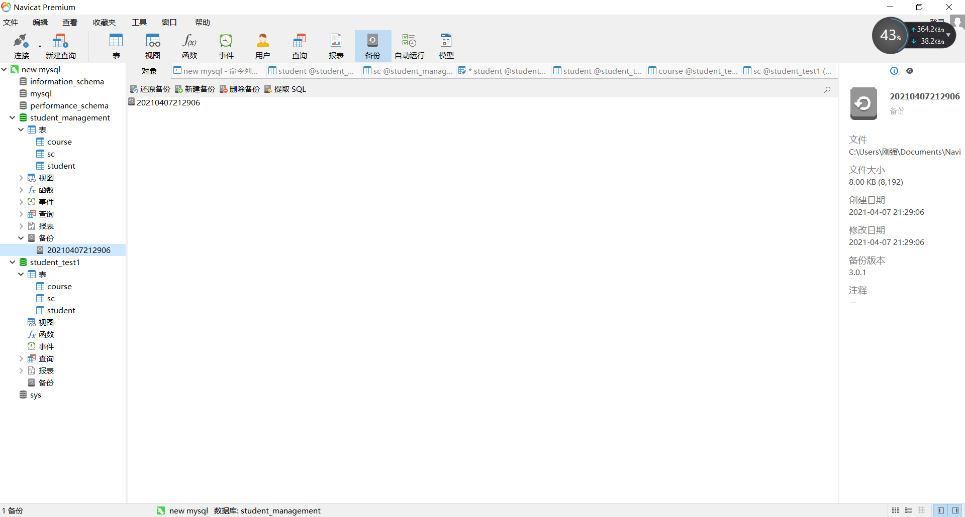 1.创建一个新的数据库,命名为“学生管理”,查看数据库信息,配置、更名及删除数据库;