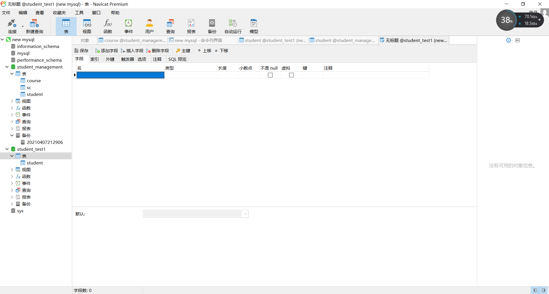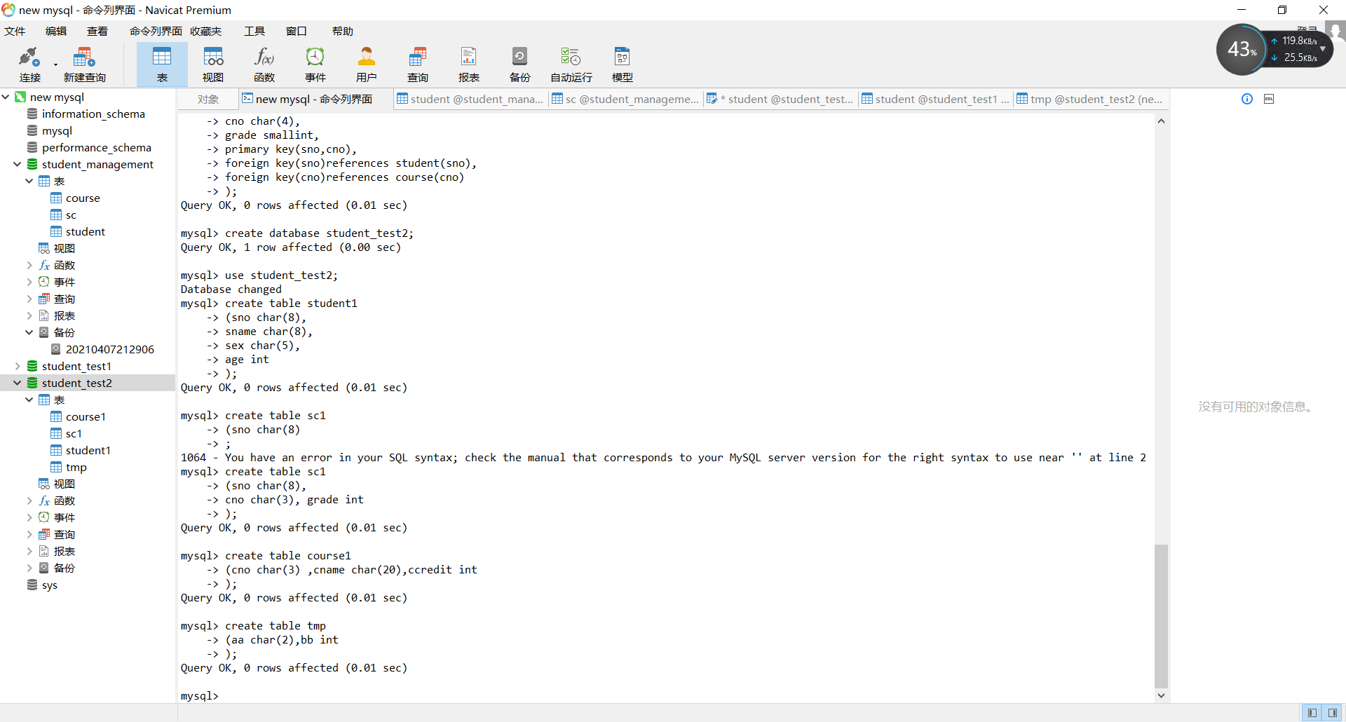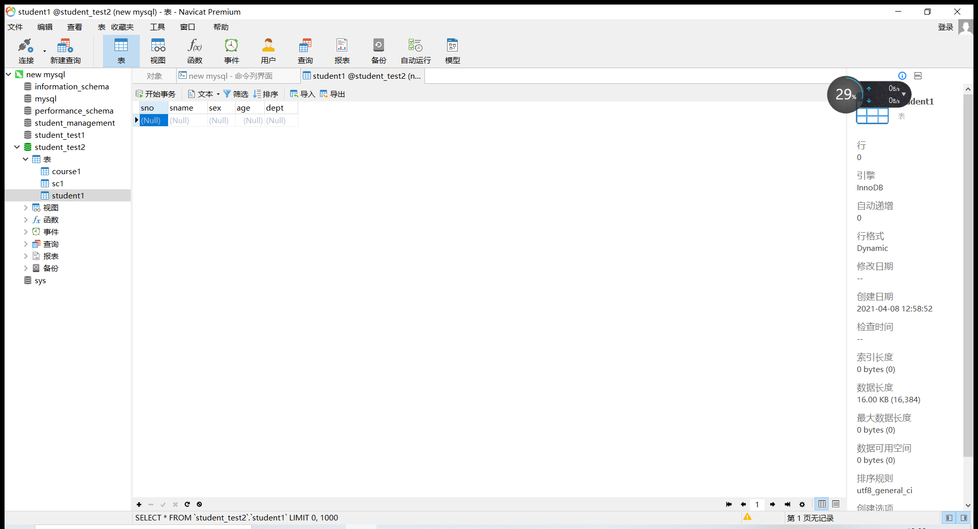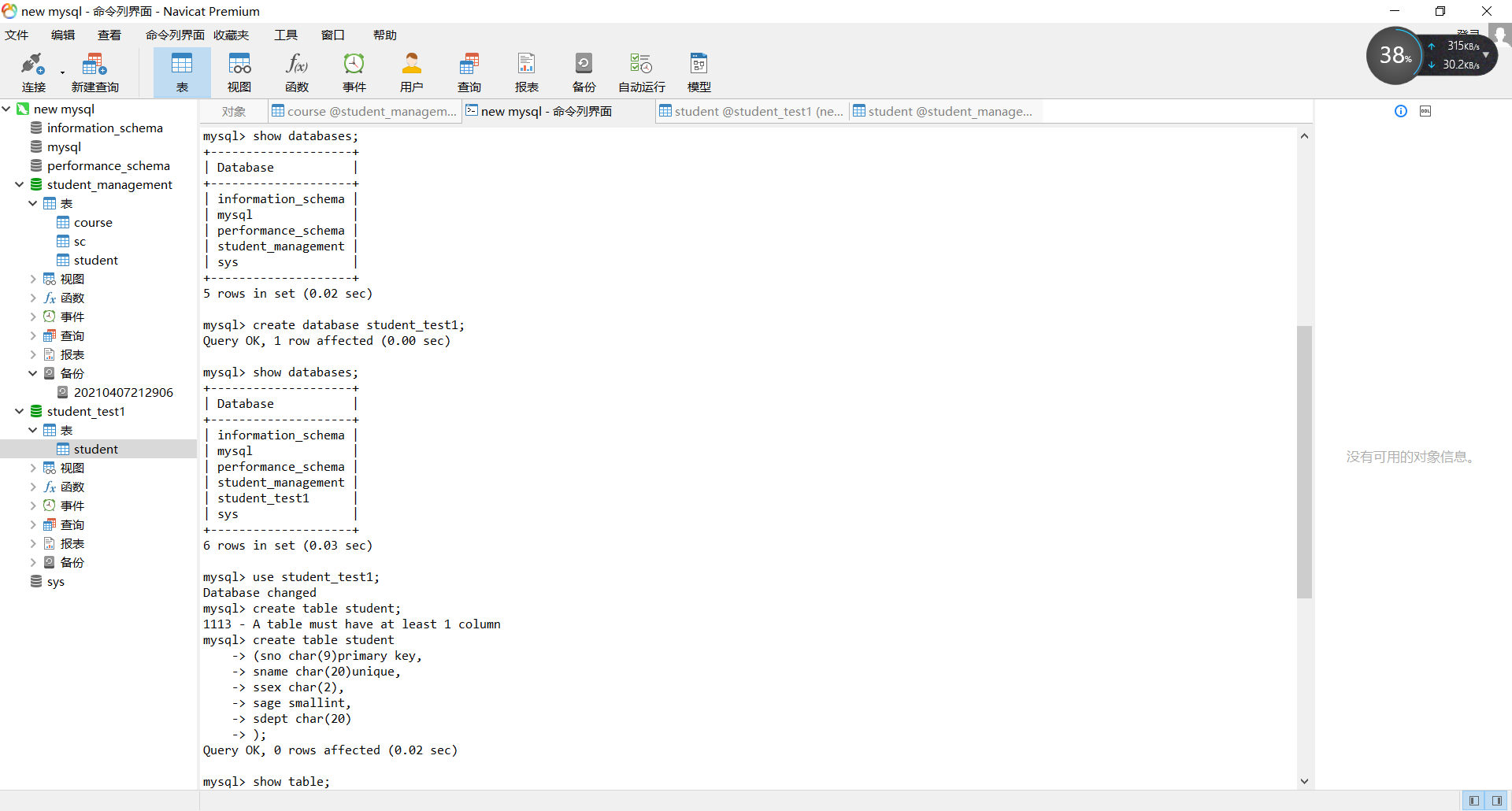 方法一:通过mysql命令列界面编写代码create database student_test1创建数据库;