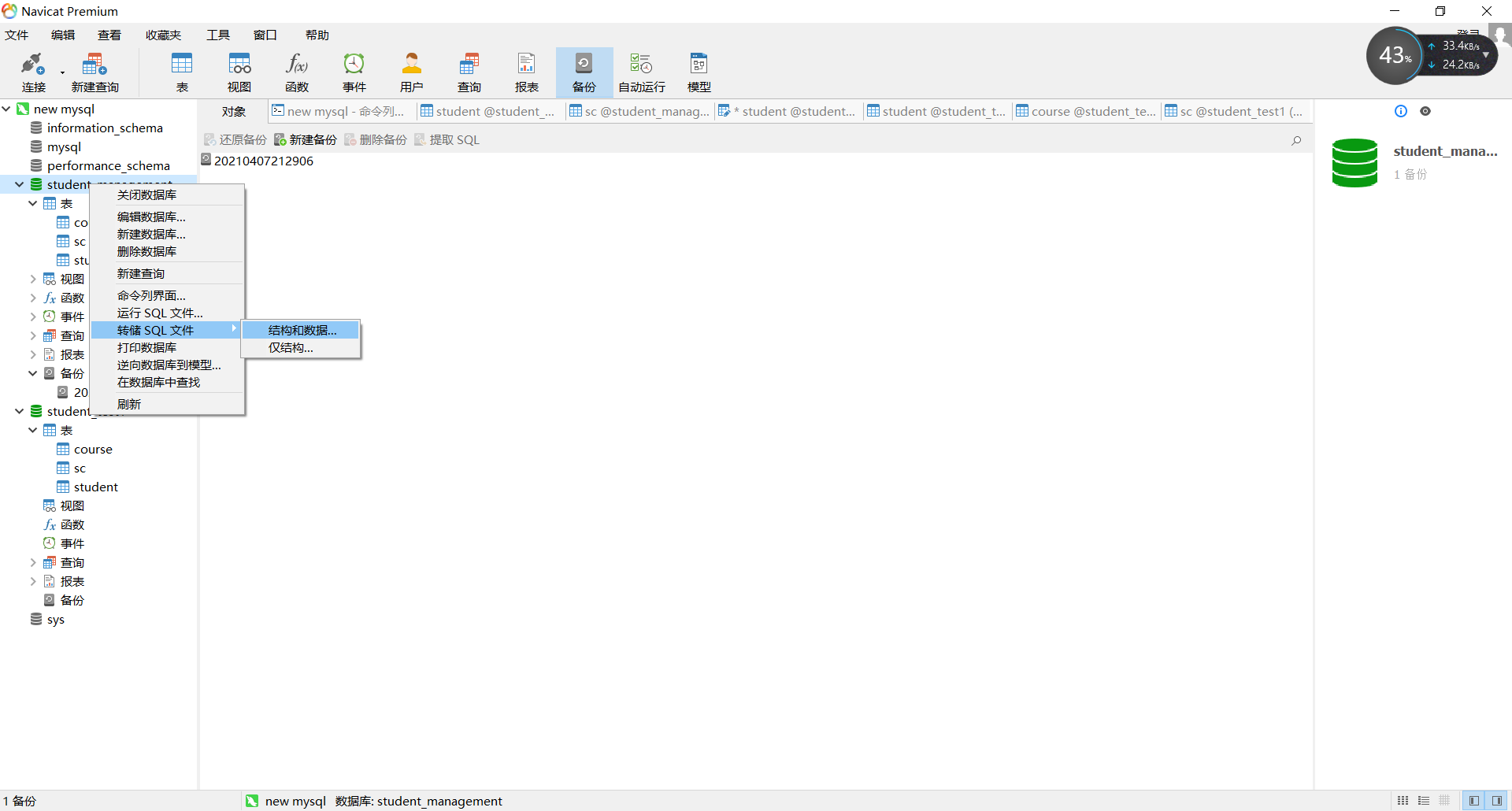 鼠标指到数据库(模式),鼠标右键点击转存SQL文件的结构与数据,选择保存路径,就成功倒出数据库的数据。
