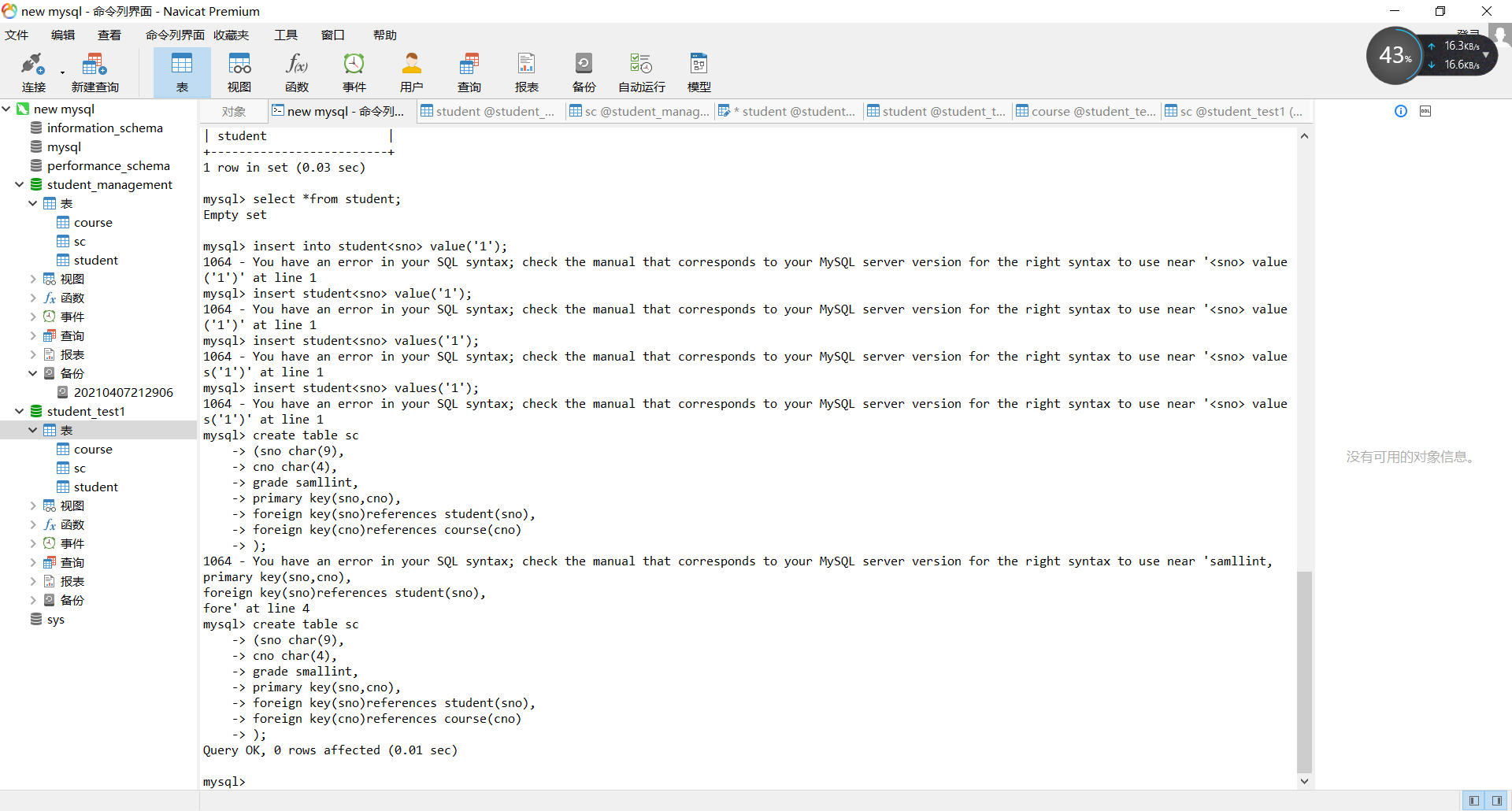 通过此次实验,成功安装了mysql和图形化工具navicat,学习navicat软件的使用,成功创建表和更改表中的信息等;同时使用关系数据库标准语言sql在命令列中也成功创建数据库和表等,并且使用多种方法更改表和删除表等各项操作,进一步学习了sql语言的使用,对今后学习有了较大的帮助。