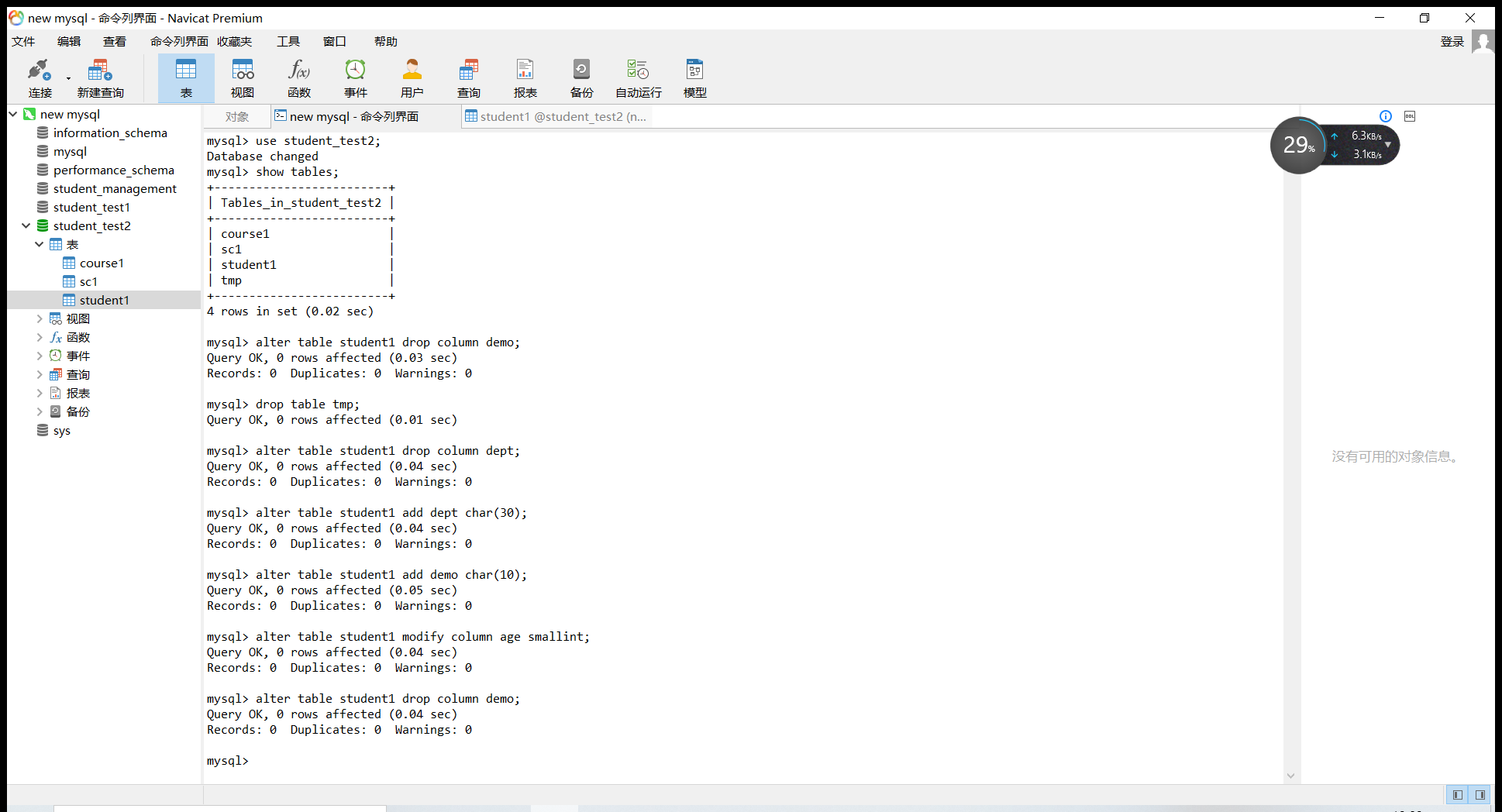 2.修改student1表,增加二个字段,dept char(30),demo char(10),使用语句alter table student1 add dept char(30); alter table student1 add demo char(10);并将 age 的属性改为smallint;使用语句alter table student1 modify column age smallint;