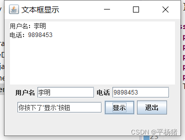 | 三、源代码 //TextFrameDemo.java package 实验4; import javax.swing.*; import java.awt.*; import java.awt.event.*; public class TextFrameDemo { public static void main(String[] args) { TextFrame g=new TextFrame(); g.setVisible(true); } } class TextFrame extends JFrame{ private JTextArea ta; private JTextField name; private JTextField phone; private JTextField show; private JButton a,b; TextFrame(){ setTitle("文本框显示"); setBounds(200,300,370,280); setLayout(new FlowLayout()); ta=new JTextArea(7,30); add(ta); name=new JTextField(10); add(new JLabel("用户名")); add(name); phone=new JTextField(10); add(new JLabel("电话")); add(phone); show=new JTextField(15); add(show); a=new JButton("显示"); a.addActionListener(new ActionListener(){ public void actionPerformed(ActionEvent e) { ta.setText("用户名:"+name.getText()+"\n"+"电话:"+phone.getText()); show.setText("你按下了“显示”按钮"); } }); add(a); b=new JButton("退出"); b.addActionListener(new ActionListener(){ public void actionPerformed(ActionEvent e) { dispose(); } }); add(b); } } 四、实验结果测试、收获与体会: 从该实验中学习到了swing基本组件的使用,对文本框和文本域以及标签、按钮有了深度的学习,并且对java事件处理中的委托事件模型进行学习,对按钮的处理也有了进一步的 提升。 | |