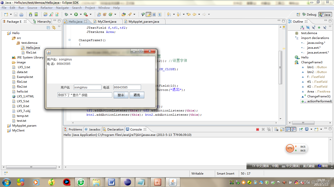| 二、实验内容: 二.了解事件处理机制 在图形用户界面中,程序和用户的交互是通过组件响应各种事件来实现的。例如,用户单击了一个按钮,意味着发生了按钮的单击事件;选中下拉框中的一个选项,意味着发生了一个选项事件。在Java 中能产生事件的组件叫做事件源,如按钮。如果希望对单击按钮事件进行处理,可给事件源(按钮)注册一个事件监听器(如包含按钮的容器),如同签订了一个委托合同,当事件源发生事件时,事件监听器就代替事件源对发生的事件进行处理,这就是所谓的委托事件处理机制。 在窗口中添加组件 (1)程序功能:在窗口中添加组件。 (2)编写程序文件,响应按钮事件,当按下显示按钮时,文本框1中显示此时用户名和电话,文本框2显示“你按下了“显示”按钮”。当按下退出时,程序关闭。 (3)编译并运行程序,界面窗口如图所示。
