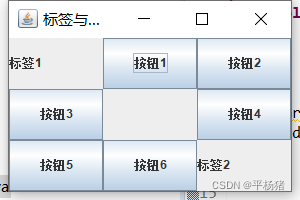| 三、源代码 //GridLayoutFrameDemo.java package 实验4; import javax.swing.*; import java.awt.*; public class GridLayoutFrameDemo { public static void main(String[] args) { GridLayoutFrame g=new GridLayoutFrame(); g.setVisible(true); } } class GridLayoutFrame extends JFrame{ GridLayoutFrame(){ setTitle("标签与按钮"); setSize(300,200);//设置框架大小 setLocation(300,200);//设置框架在屏幕上的显示位置 setDefaultCloseOperation(JFrame.EXIT_ON_CLOSE);//设置关闭 setLayout(new GridLayout(3,3));//设置框架使用3行3列的网格布局器 add(new JLabel("标签1")); for(int i=1;i<=3;i++) add(new JButton("按钮"+i)); add(new JLabel()); for(int i=4;i<=6;i++) add(new JButton("按钮"+i)); add(new JLabel("标签2")); } } 四、实验结果测试、收获与体会: