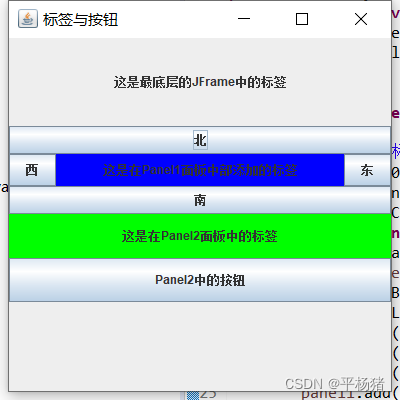 | 二、实验内容: 3. 在面板中添加组件 (1) 程序功能:在Jframe中添加面板容器,并分别在Jframe、面板容器中添加组件并使用不同的布局管理方式。 (2) 编写2.java 程序文件,显示结果如图所示。要求设置最底层的JFrmae容器为顺序布局,Jframe框架中直接添加一个标签,同时在Panel1中以边界布局添加四个方向按钮和一个标签.Panel2中以网格布局添加一个标签一个按钮。 | |
