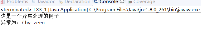 三、源代码 //LX3_1.java public class LX3_1 { public static void main(String args[]) { System.out.println("这是一个异常处理的例子"); try { int a=2; int b=0; int c; c=a/b; } catch(ArithmeticException e) { System.out.println("异常为:"+e.getMessage()); } } } 四、实验结果测试、收获与体会: