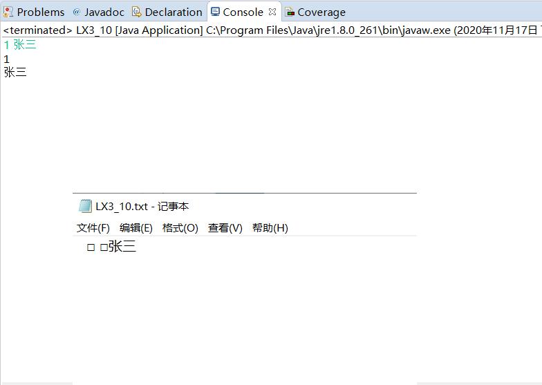 三、源代码 //LX3_10.java import java.io.*; import java.util.Scanner; public class LX3_10 { public static void main(String args[])throws Exception { FileOutputStream fos=new FileOutputStream("LX3_10.txt"); DataOutputStream dos=new DataOutputStream(fos); Scanner in=new Scanner(System.in); int a=in.nextInt(); String s=in.next(); dos.writeInt(a); dos.writeUTF(s); dos.close(); FileInputStream fis=new FileInputStream("LX3_10.txt"); DataInputStream dis=new DataInputStream(fis); System.out.println(dis.readInt()); System.out.println(dis.readUTF()); dis.close(); } } 四、实验结果测试、收获与体会: