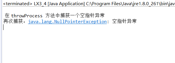 三、源代码 //LX3_4.java public class LX3_4 { static void throwProcess() { try { throw new NullPointerException("空指针异常"); } catch (NullPointerException e) { System.out.println("\n 在 throwProcess 方法中捕获一个"+e.getMessage()); throw e; } } public static void main(String args[]) { try { throwProcess(); } catch (NullPointerException e) { System.out.println("再次捕获:"+e); } } } 四、实验结果测试、收获与体会: