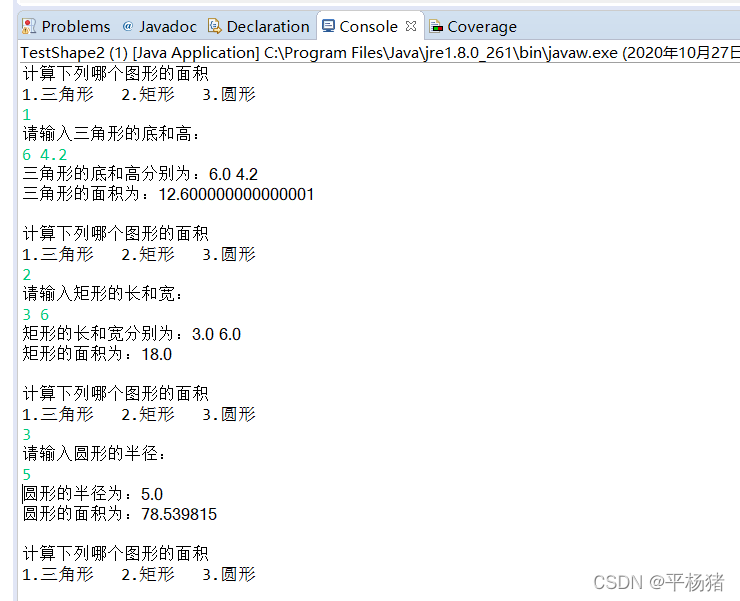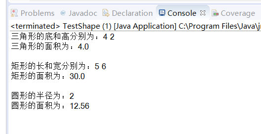 | 二、实验内容: (四).综合练习 1.抽象类 (1)设计一个形状类 Shape,包含一个 getArea()方法,该方法不包含实际语句。 (3)设计一个 TestShape 类,在 main 函数中新建三种类型的对象s1、s2、s3,输出 area。 | |