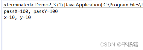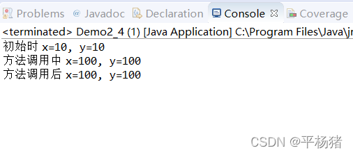 | 二、实验内容: (三). 2.方法中参数传递的练习 编写一个调用对象方法的程序文件Demo2_4.java。 (1)程序功能:通过调用对象的方法在方法调用后修改成员变量的值。 (2)Demo2_3.java 程序源代码如下。 class Demo2_3{ public static void main(String[] args) { Power p=new Power(); p.ff2(10,10); System.out.println("方法调用后 x="+p.x+", y="+p.y); } } class Power{ int x=10, y=10; void ff2(int passX, int passY) { System.out.println("初始时 x="+x+", y="+y); x=passX*passX; y=passY*passY; System.out.println("方法调用中 x="+x+", y="+y); } } (3)编译Demo2_3.java,分析运行结果。 | |