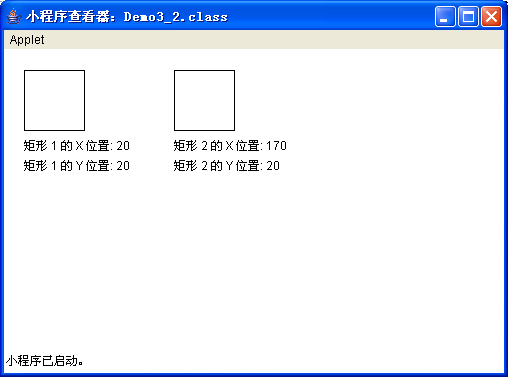 | 二、实验内容: 1.编写Applet 程序 (1)程序功能:这个Applet 程序要在页面上输出两个矩形,并伴有文字输出。 (2)定义一个MyBox类,包含有x, y, width, height四个成员变量以及MyBox(), MyBox(int xPos, int yPos, int w, int h), void setPosition (int xPos, int yPos) , void setSize (int w, int h), int getX() ,int getY(),void draw(Graphics g) 成员方法.