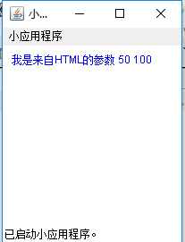 三、源代码 import java.applet.Applet; import java.awt.*; public class PassNumber extends Applet { String str; int x,y; public void init() { str = getParameter("string"); x = Integer.valueOf(getParameter("x1")); y = Integer.valueOf(getParameter("x2")); } } <body> <applet code="PassNumber.class" height=200 width=300> <param name=string value="我是来自HTML的参数"> <param name = x1 value="50"> <param name = x2 value="100"> </applet> </body> <html> 四、实验结果测试、收获与体会: