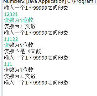 三、源代码 //判断一个数是几位数,判断回文32123等 import java.util.Scanner; public class Number2 { public static void main(String[] args)throws Exception { while(true) { Scanner s=new Scanner(System.in); System.out.println("输入一个1~99999之间的数"); String number=s.next(); int p=number.length(); System.out.println("该数为"+p+"位数"); StringBuffer number2=new StringBuffer(number);//将number转化为StringBuffer number2.reverse(); String number3=number2.toString(); boolean equal=number3.equals(number); if(equal) System.out.println("该数为回文数"); else System.out.println("该数不是回文数");