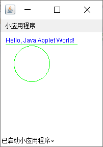三、源代码 import java.applet.*; import java.awt.*; import javax.swing.*; public class HelloWorld2 extends Applet{ public void paint(Graphics g) { g.setColor(Color.BLUE); g.drawString("Hello, Java Applet World!",10,20); g.setColor(Color.GREEN); g.drawLine(10,24,150,24); g.drawOval(26,26,70,70); } } 四、实验结果测试、收获与体会: 能够运行小程序,对小程序的输出和颜色的改变和画图功能进行学习,有所收获 |