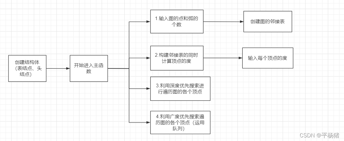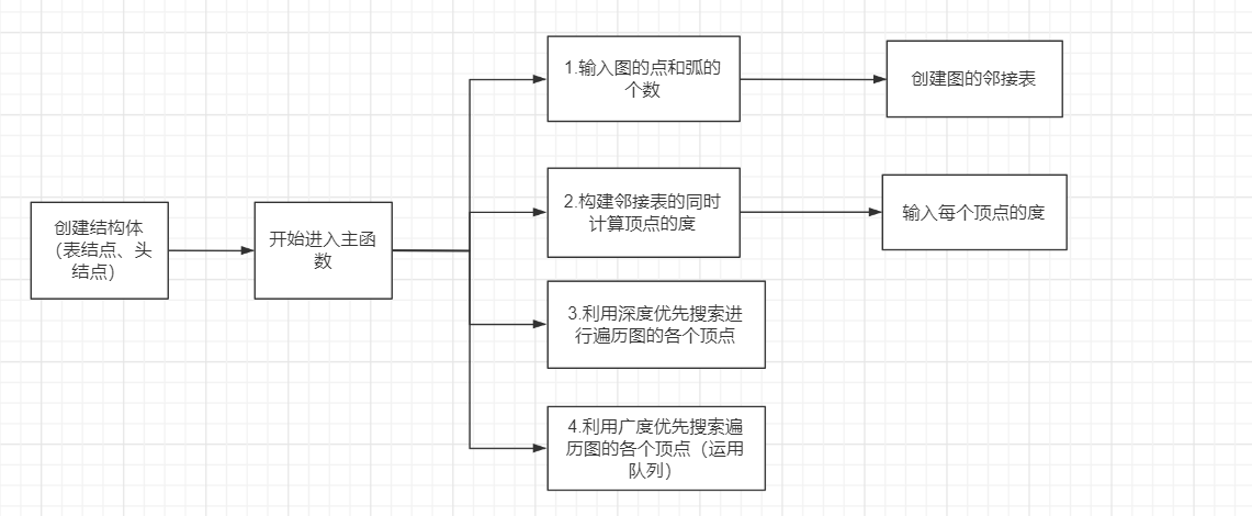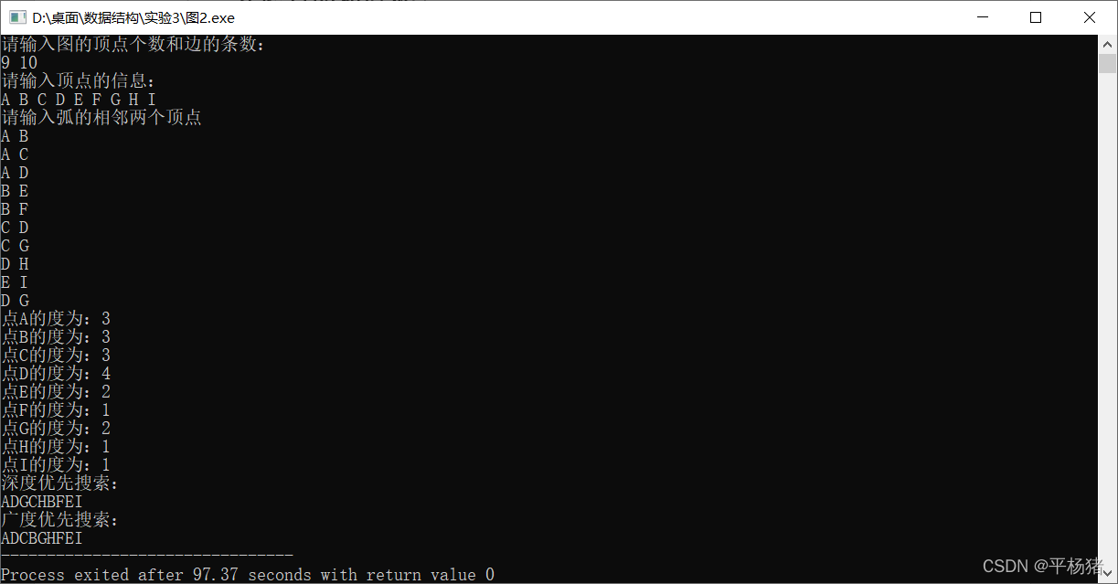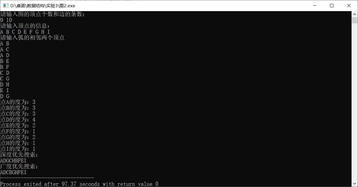 输入图的顶点和弧的个数,从而输入顶点信息和相对应弧的相邻两个顶点,建立图的邻接表,进而输出每个顶点的度,利用深度优先搜索和广度优先搜索进行图的遍历。