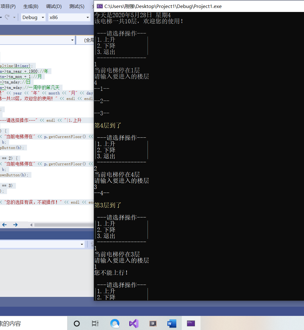 输出年月日,然后需要上升电梯输入1,输入要到的楼层为4,从而到达楼层;下降电梯输入2,输入将要到达的楼层3,电梯又开始运行;电梯在3层,输入1要上升,并且上升到第1层,此时就不能上升,输出了不能上行,要重新输入1上升还是2下降,从而继续开始电梯的升降。