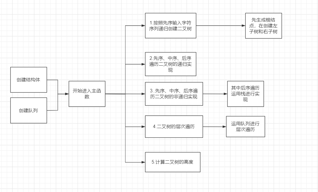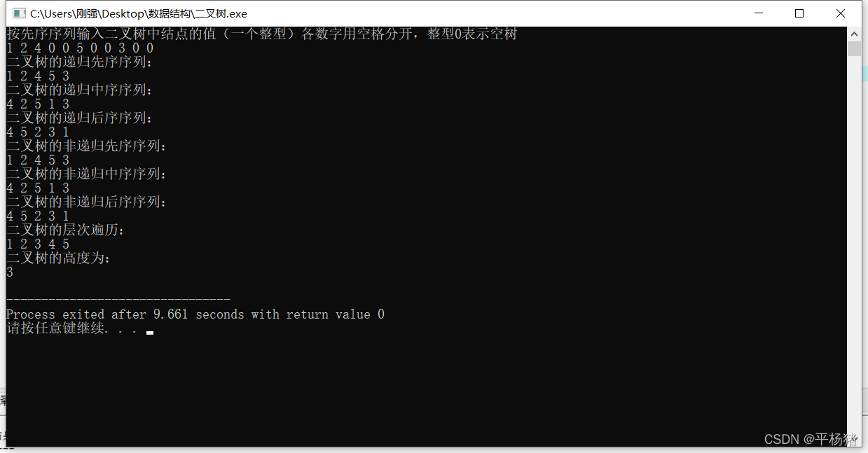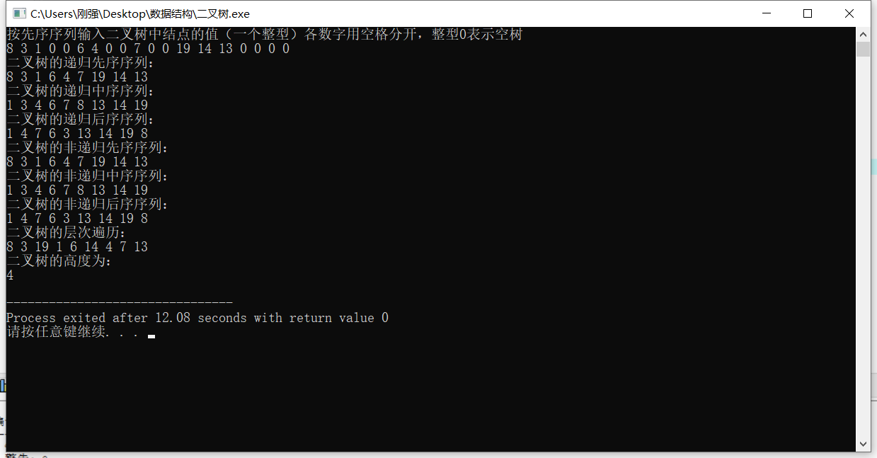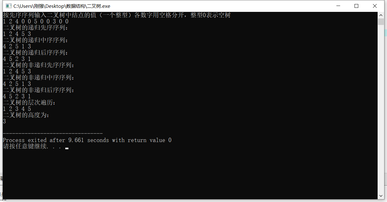 按先序序列输入二叉树中结点的值(一个整型)各数字用空格分开,整型0表示空树,依次用先序、中序、后序遍历的递归函数实现遍历输出,再依次用先序、中序、后序遍历的非递归函数进行遍历输出,得到以上结果。再利用队列实现二叉树的层次遍历,进行输出。最后输出树的高度。